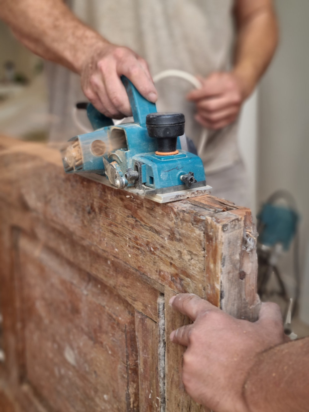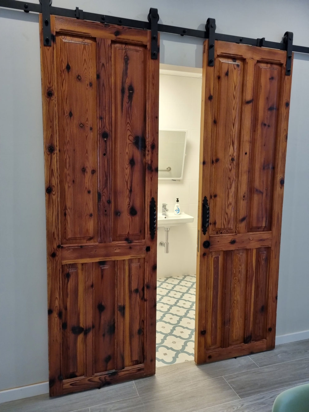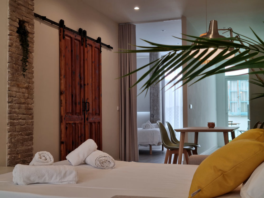 El proyecto recupera el ladrillo visto y reutiliza puertas originales, integradas como cabecero y elemento protagonista del diseño, aportando identidad y coherencia al conjunto.